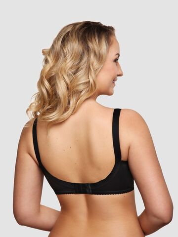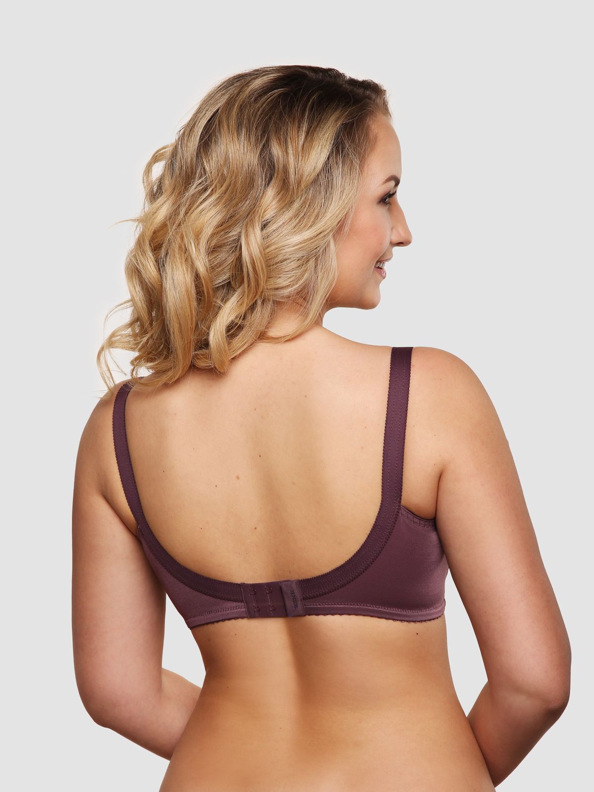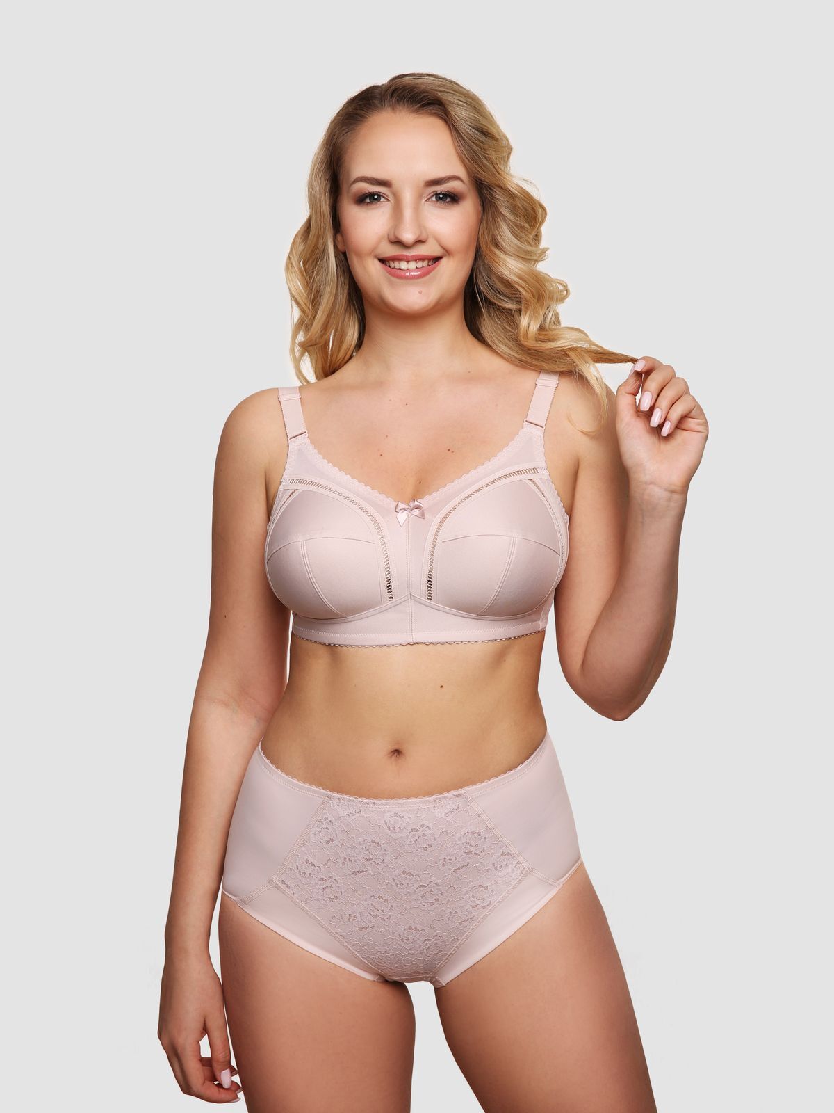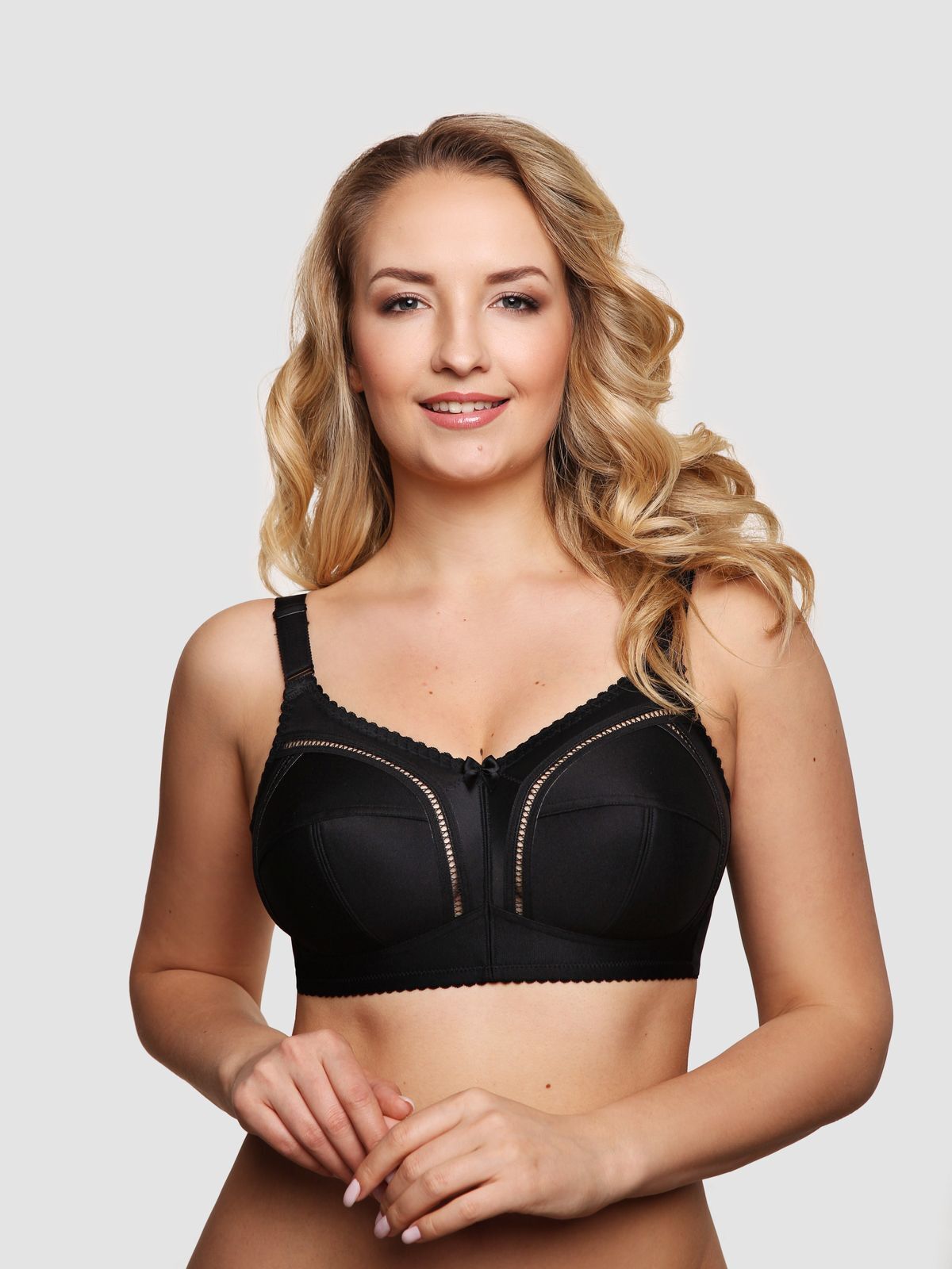 Классический бескаркасный бюстгальтер с мягкой чашкой, для большой полнотной группы. Нижняя часть чашек и пояс ламинированы хлопком, что придает стабильность и комфорт, как поддерживая грудь, так и улучшая гигроскопичность при носке. Наружные швы обработаны декоративной лентой «мережка», что придает обычному классическому бюстгальтеру шарм и выразительность. Внутренние швы обработаны мягкой отделочной тесьмой, что позволяет швам не натирать чувствительную кожу. Бретель классическая, непосредственно предназначена для большой размерной группы,  с фронтальной регулировкой, для большего удобства.