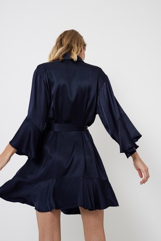 Представляем вашему вниманию потрясающий халат Cressida — идеальное сочетание лёгкого комфорта и женственной элегантности. Этот халат из блестящей вискозы красиво драпируется и имеет насыщенный тёмно-синий цвет. Дизайн отличается слегка приспущенными плечами и широкими рукавами. Нежный бахромчатый край украшает рукава и нижний край, придавая изделию романтическое очарование. Независимо от того, отдыхаете ли вы после долгого дня или наслаждаетесь спокойным утром, халат Cressida — это изящный и стильный способ расслабиться. Насладитесь непревзойденной ночной роскошью с помощью этого изысканного изделия.