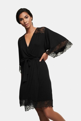 Изделие с поясом, на запахе, декорировано цветочным кружевом.