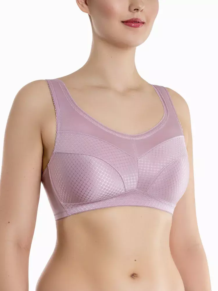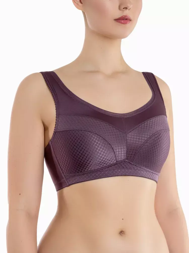 Классический бескаркасный бюстгальтер с мягкой чашкой, для большой полнотной группы. Чашки выполнены из эластичного шелковистого на ощупь полотна с жаккардовым геометрическим орнаментом "ромбики". Нижняя часть чашек усилена изнутри сеткой, что придает стабильность, поддерживая грудь. Линия декольте отделана плоской эластичной бейкой. Плоские внутренние швы не натирают чувствительную кожу. Широкие неэластичные бретели на мягкой подкладке переходят в растяжимые на спинке и регулируются. Вертикальные косточки на боковых панелях не дают ткани «скрутиться» на больших размерах.