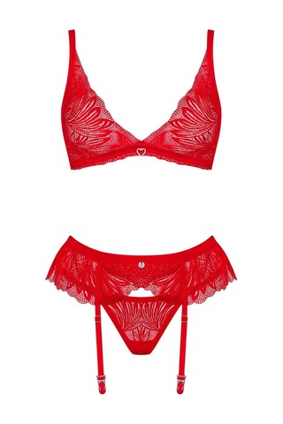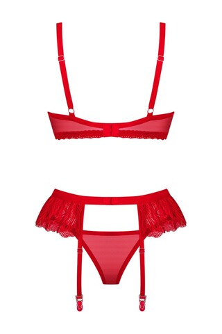 Красный комплект Chilisa, состоящий из пояса для подвязок, стрингов и бюстгальтера, многоступенчатое крепление на бюсте и регулируемые бретельки – обеспечивают идеальную посадку. Маленькая подвеска в форме сердца - аксессуар, украшенный цирконами. Чулки не входят в комплект – дополните свой наряд и наденьте их.