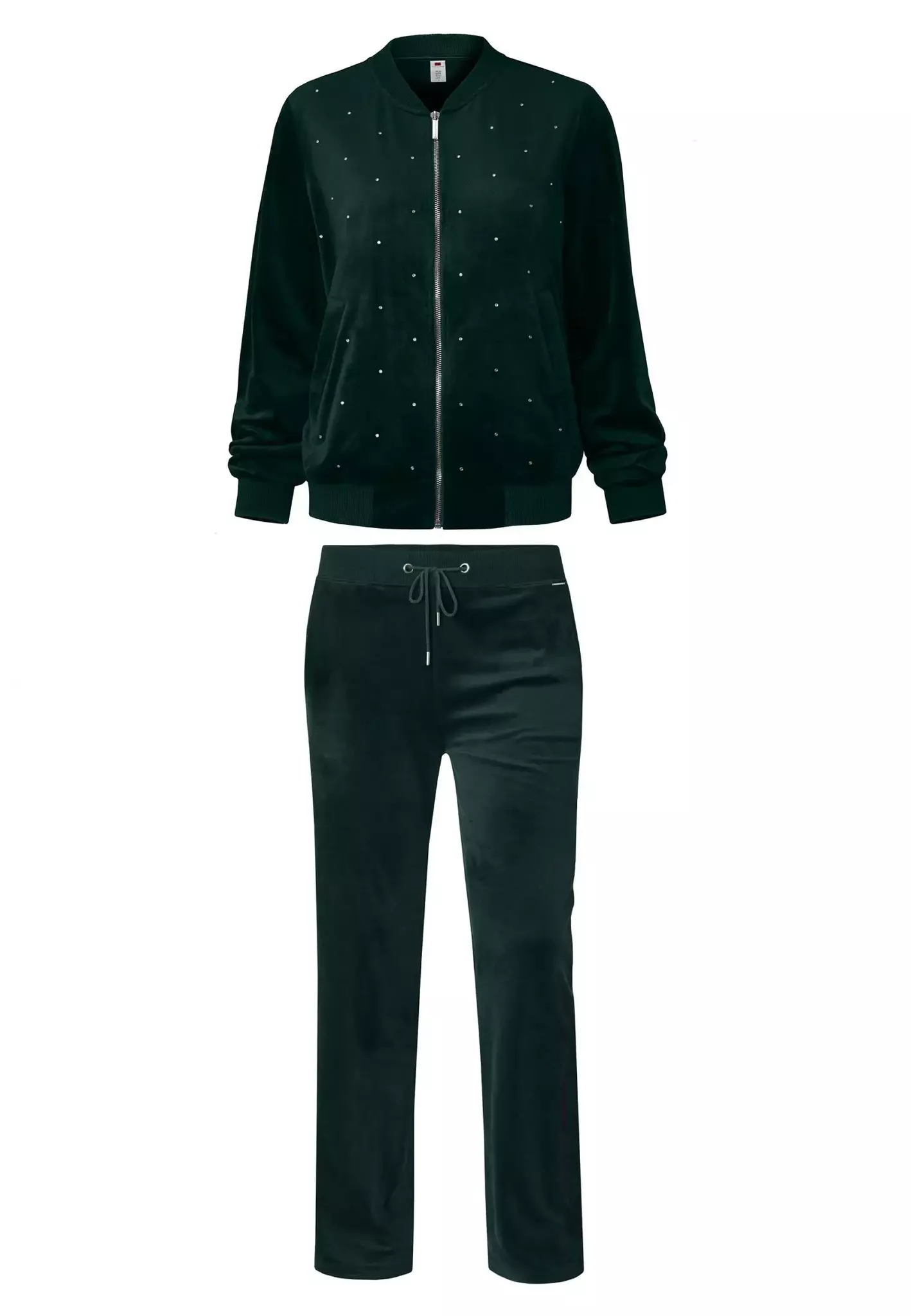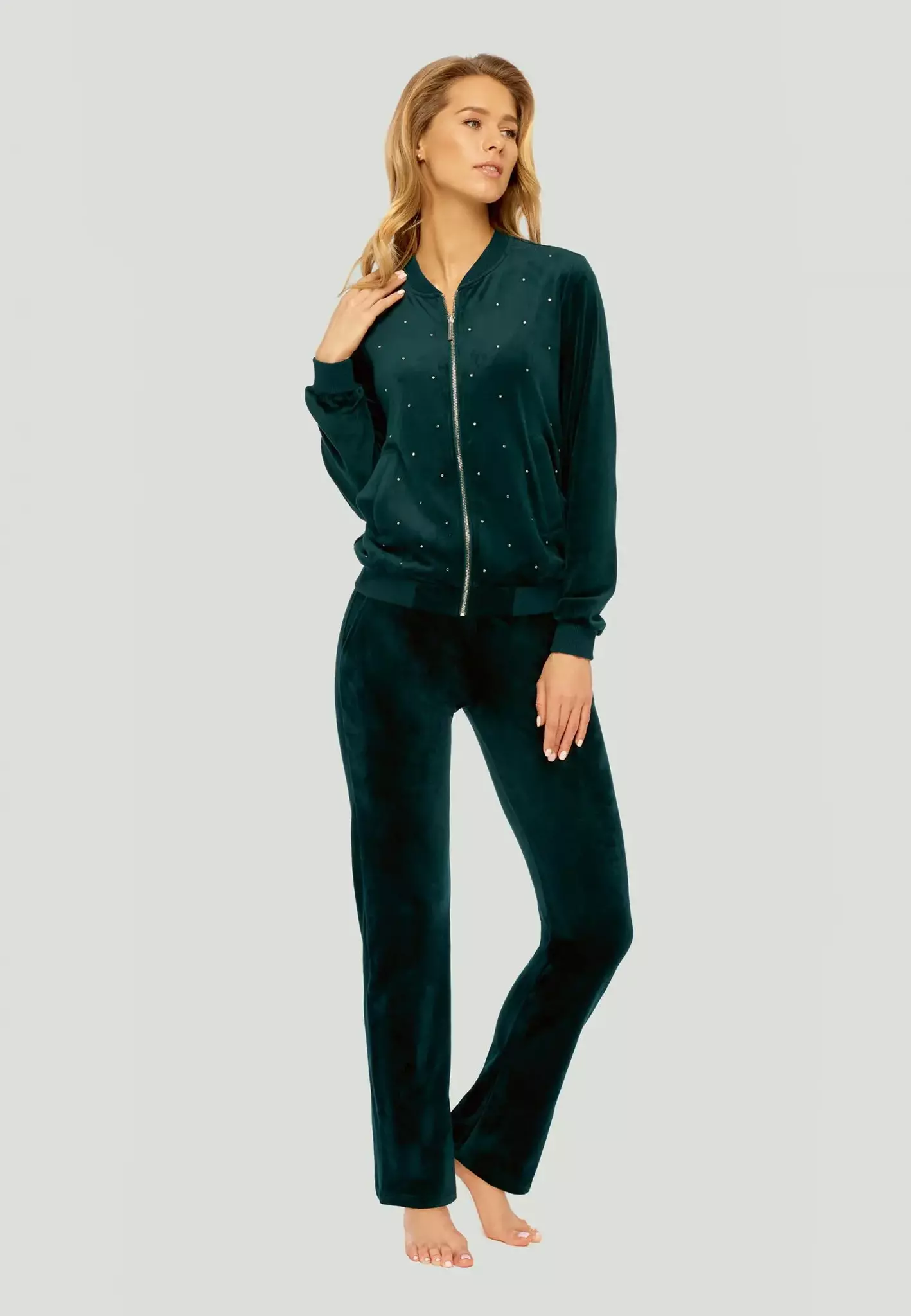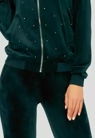 Куртка-бомбер на молнии, перед украшен стразами; воротник, манжеты и пояс выполнены из вязаной резинки, карманы с листочкой.