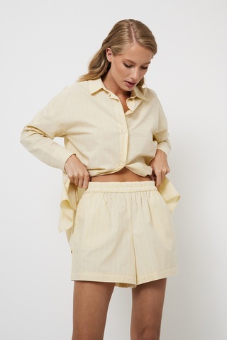 Представляем вам комплект Limonella, идеально подходящий для отдыха в шезлонге или на пляже. Изготовлен из лёгкого хлопка, он украсит ваш гардероб жизнерадостным жёлтым цветом, а игривые белые полоски придадут ему уникальный вид. В этот комплект входят рубашка с длинными рукавами на пуговицах и классическим воротником. Широкие шорты с эластичным поясом, декоративными пуговицами и удобными карманами. Комплект Limonella отличается непринуждённой элегантностью и радостным очарованием, что делает его идеальным нарядом для непринуждённого комфорта и яркого стиля.