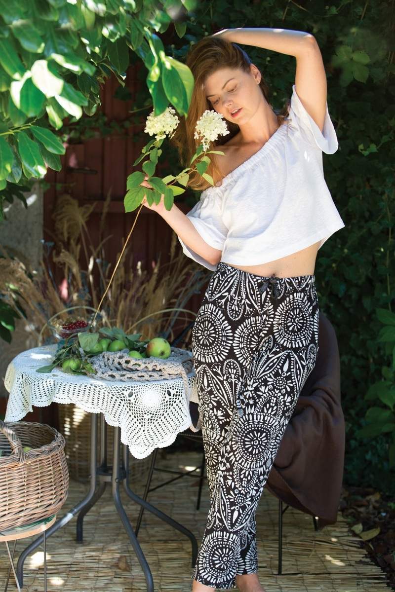 Женский комплект со штанами LHS 945 1 от европейского производителя KEY. Легкий и летящий костюм из хлопка и вискозы смотрится весьма оригинально и свежо, по-летнему. Нежный укороченный топ с широким горлом-лодочкой на резинке и свободными рукавами. А так же узорные брюки с удобными боковыми карманами. Состав: Топ: 100% хлопок Брюки: 95% вискоза, 5% эластан