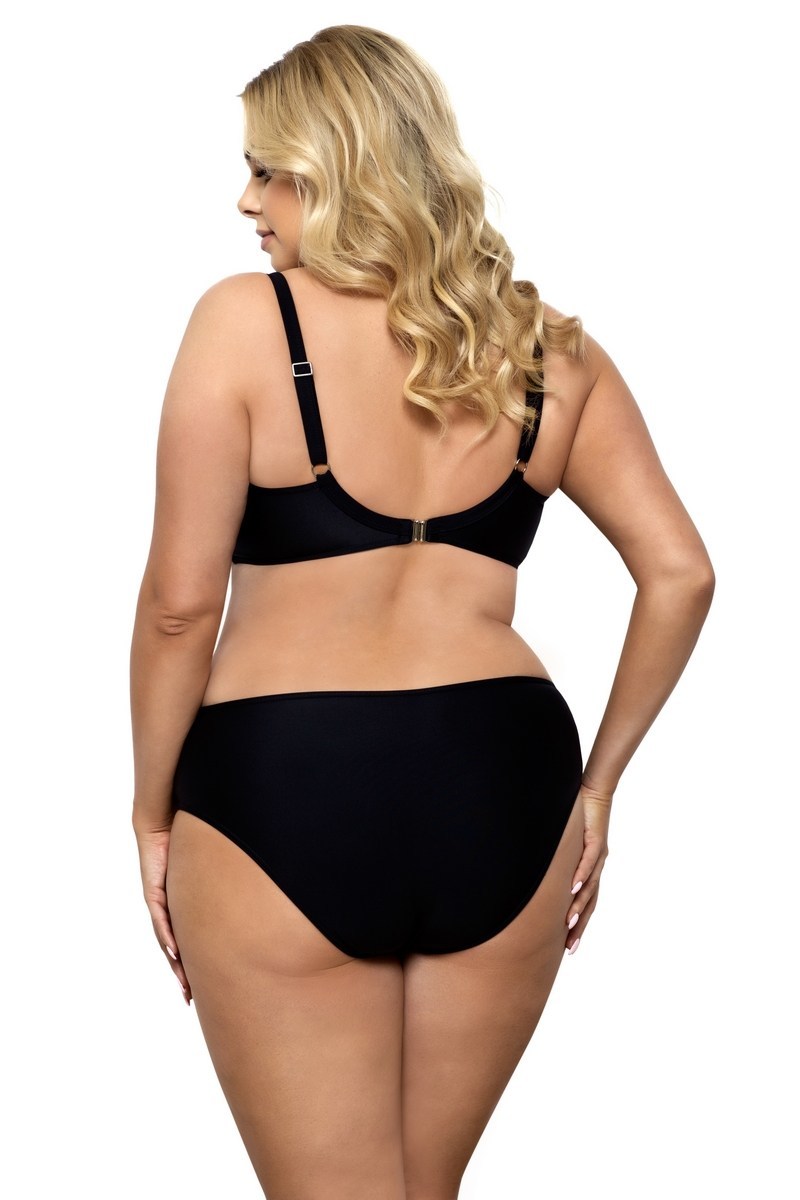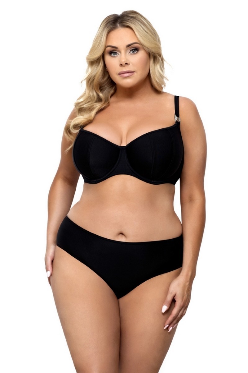 Бюстгальтер на тяжёлую грудь на косточках, оснащён боковыми поддержками, нижняя часть чашки с тонким поролоном, верхняя из черной сетки, продублированной телесной тканью, бретельки регулируются по длине, на спине застёжка из высококачественного пластика.