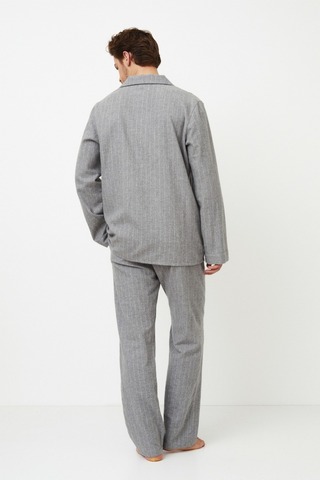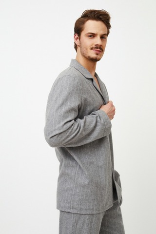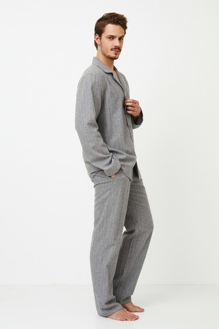 Представляем вашему вниманию длинную пижаму Carl, которая всегда будет незаменима для вашего ночного отдыха. Комплект я сшила из мягкого хлопка спокойного серого цвета в тонкую полоску. Топ с длинными рукавами и v-образным вырезом горловины, застегивающийся на пуговицы, сочетается с брюками классического кроя, украшенными удобными карманами. Этот пижамный комплект представляет собой классический образ, который никогда не выходит из моды. И не забудьте порадовать свою вторую половинку стильным нарядом — купите длинную пижаму Clara, потому что кто сказал, что перед сном нельзя устроить показ мод для двоих?
