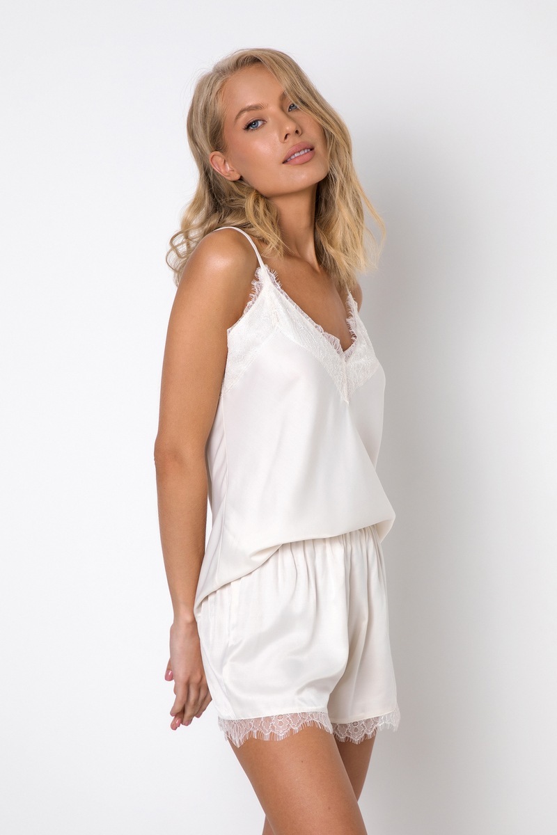 Укутайтесь в слой роскоши с этим супер мягким и сияющим пижамным комплектом Arabella. Это идеальная вещь, которую можно надеть, готовясь к знаменательному дню или медовому месяцу. Пижамный комплект украшен элегантными кружевными элементами на груди, спине и нижней части шорт. Он также оснащен регулируемыми плечевыми ремнями и эластичным поясом.