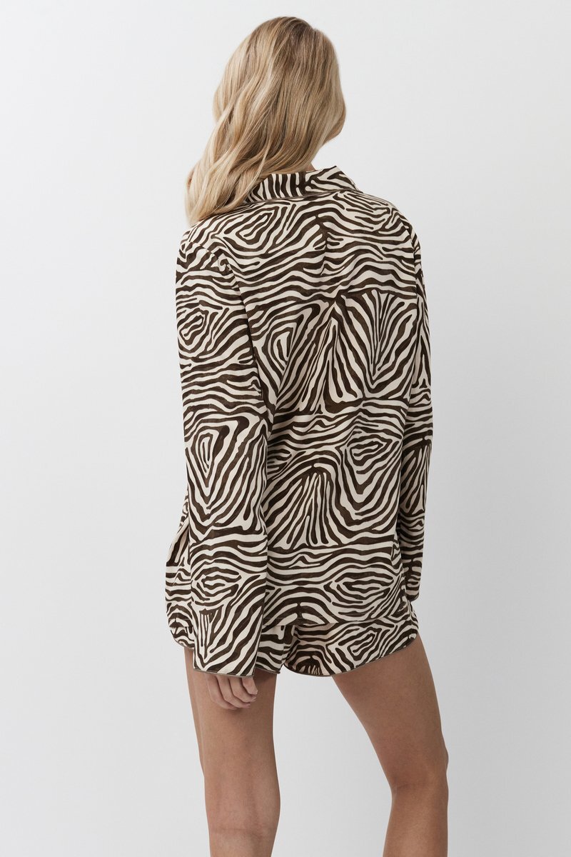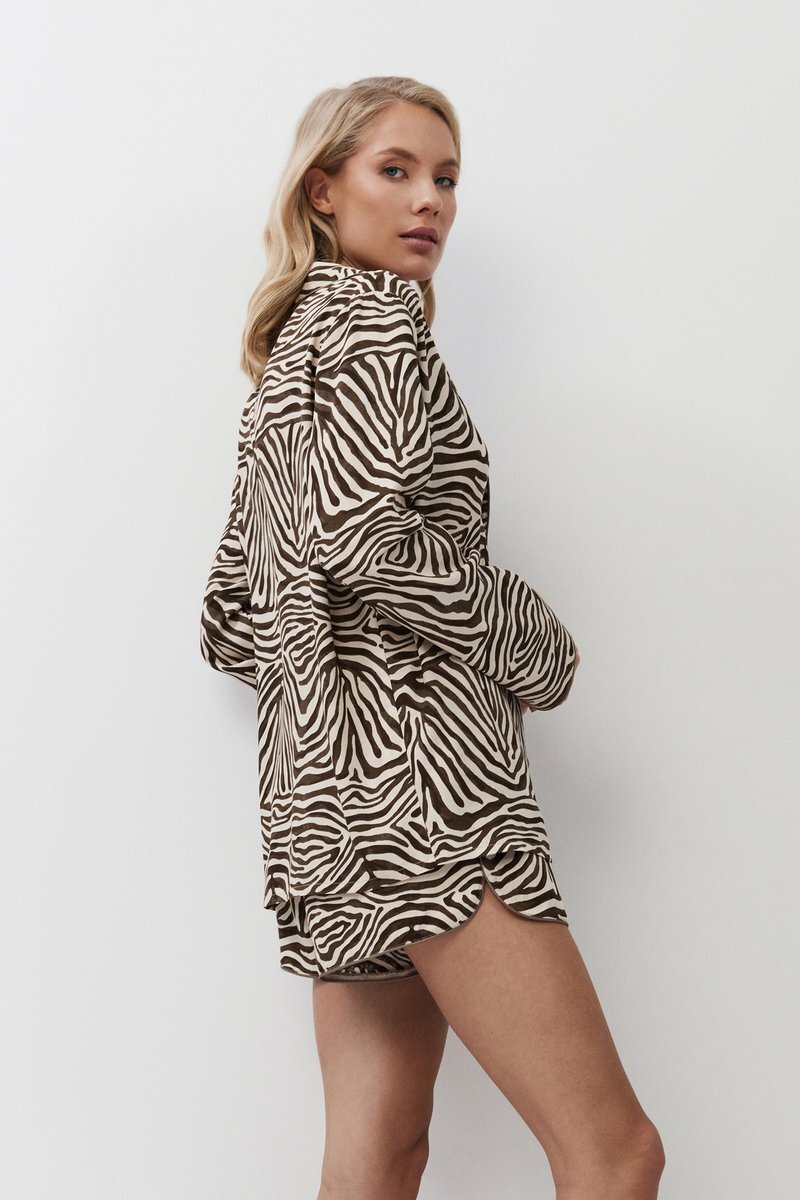 Пижама женская с шортами ELISE для вашего ночного комфорта. Пижама выполнена из вискозы с животным принтом. Рубашка на пуговицах, с длинными рукавами, отложным воротником и нагрудным карманом. Окантовка дополняет и украшает комплект. Шорты свободные, с эластичным поясом с завязкой, по бокам закругленные разрезы. Расслабьтесь с максимальным комфортом и стилем в пижаме ELISE.
