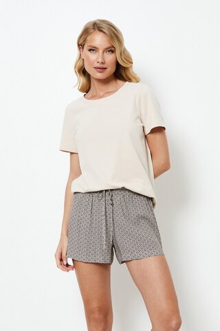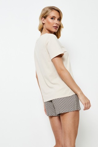 Обновите свой ассортимент одежды для сна с помощью этого уютного пижамного комплекта. Футболка из мягкого хлопка с короткими рукавами выполнена в спокойном песочном оттенке и имеет классический круглый вырез, придающий образу непринужденную простоту. Она дополнена шортами повседневного покроя, завязывающимися на талии, с разрезами по бокам на подоле для создания утонченного стиля. Эта пижама обеспечивает идеальный баланс между комфортом и изысканным шиком.