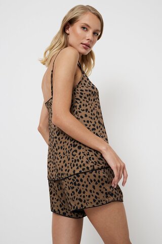 Представляем вам женскую пижаму Kianna, в которых джунгли сочетаются с блаженством перед сном в игривой интерпретации! Топ на бретелях из блестящей вискозы с элегантным прямым вырезом, украшен смелой чёрной окантовкой, которая проходит вдоль выреза спины и нижнего края. Шорты с коричнево-чёрным принтом в виде гепарда — ваш билет в мир дикого стиля. Шорты прямого кроя с эластичным поясом, удобными карманами и чёрной окантовкой внизу, добавляют нотку шика джунглей. Приготовьтесь выпустить на волю свою внутреннюю дикую кошку и понежиться в комфорте в пижаме Kianna. Кто сказал, что пижамы не могут быть невероятно стильными?