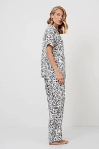 Представляем вашему вниманию длинную пижаму Beatrich — воплощение безумной мечты. Изготовлена из лёгкой вискозы с шикарным серым леопардовым принтом. Рубашка на пуговицах с короткими рукавами, манжетами и V-образным вырезом. В сочетании с брюками в тон с обычным поясом, украшенным коричневой лентой и боковыми манжетами, этот комплект излучает необузданное очарование. Дайте волю своему воображению в нашей длинной пижаме Beatrich, которая идеально подойдёт тем, кто не боится мечтать.