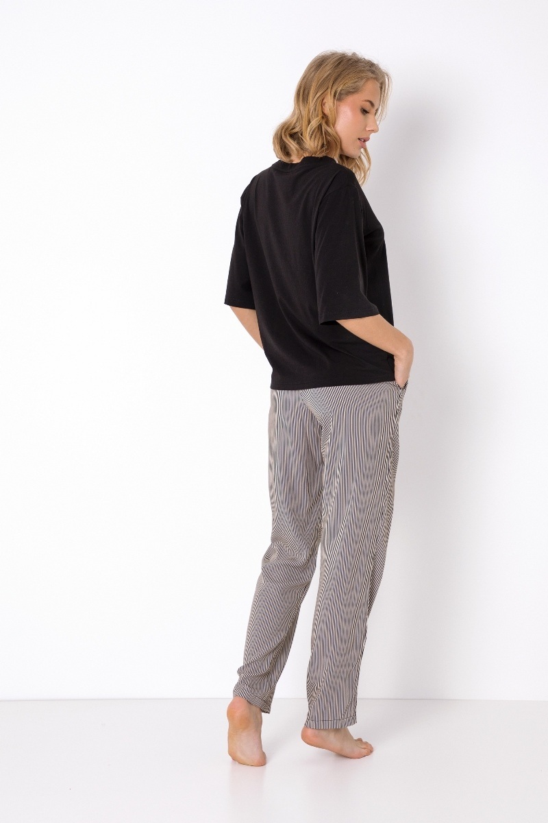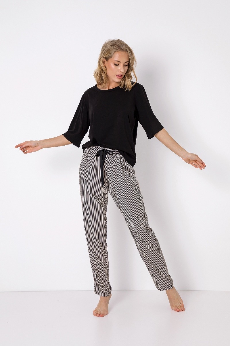 Пижама женская со штанами изготовлена из вискозы. Свободная футболка с рукавом 3/4 из нежной вискозы. Штаны свободного кроя из текстильной вискозы, пояс на резинке со шнурком.
