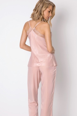 Пижама женская со штанами. Верх пижамы декорирован нежным кружевом. Тонкие регулируемые бретели. Штаны с эластичной резинкой на поясе дополнены шнурком.