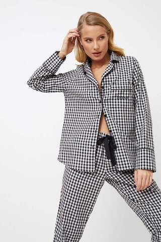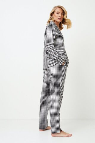 Откройте для себя элегантность, неподвластную времени, с пижамой Philippa long. В сочетании черных и белых оттенков в клетку вы почувствуете спокойствие и гармонию, которые приведут вас к спокойному сну. Рубашка с длинными рукавами, v-образным вырезом горловины и карманом, украшенным вышивкой "Мечта", а также застегивающийся на пуговицы топ с потайной вышивкой "со мной" между пуговицами, добавляющей оригинальности вашему образу перед сном. Рубашка украшена тонким черным кантом, который дополняется черной поясной лентой на брюках, придающей образу элегантность и стиль. Не оставляйте без внимания свою вторую половинку: они могут присоединиться к уютному веселью в пижаме Philip pajama long, пока вы будете качаться в пижаме Philippa pajama long. Это идеальное сочетание для стильного и уютного вечера — просто не забудьте разделить с ней комфорт!