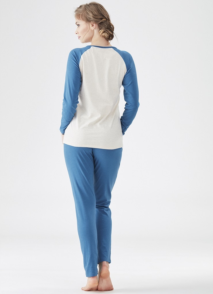 Хлопковая женская пижама LNS 590 18/19. Выполнена из мягкого хлопчатобумажного трикотажа с уникальным бежевым меланжевым плетением. Кофта с круглым вырезом и крупным цветочным принтом. Рукав реглан длинный, в тон брюк. Брюки на резинке, прямые, зауженные к низу.