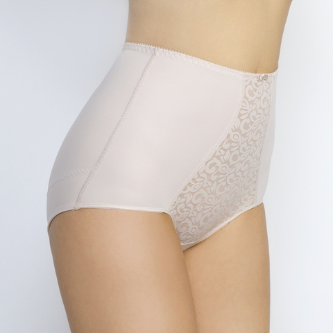 Трусы-макси с завышенной линией талии и низким вырезом по линии бедер. Данная конструкция придает трусам небольшой моделирующий эффект. Фронтальная часть дублируется сеткой, для дополнительной поддержки живота. По «спинке» шов, который позволяет слегка приподнять ягодичную мышцу. А так же нижние поддерживающие вставки пуш-ап.