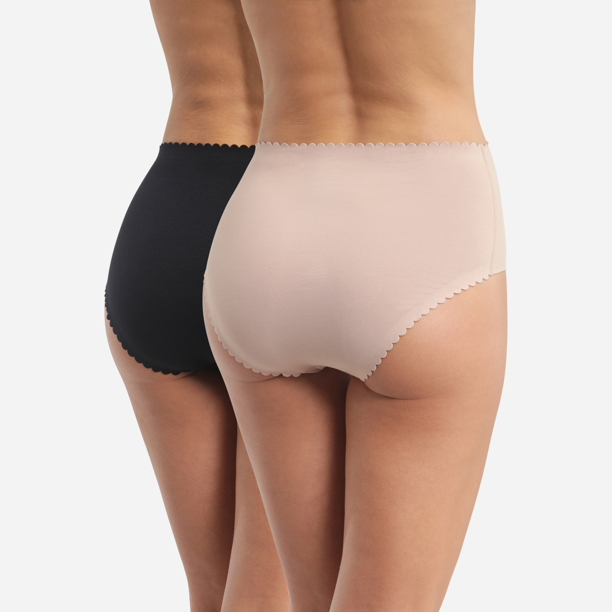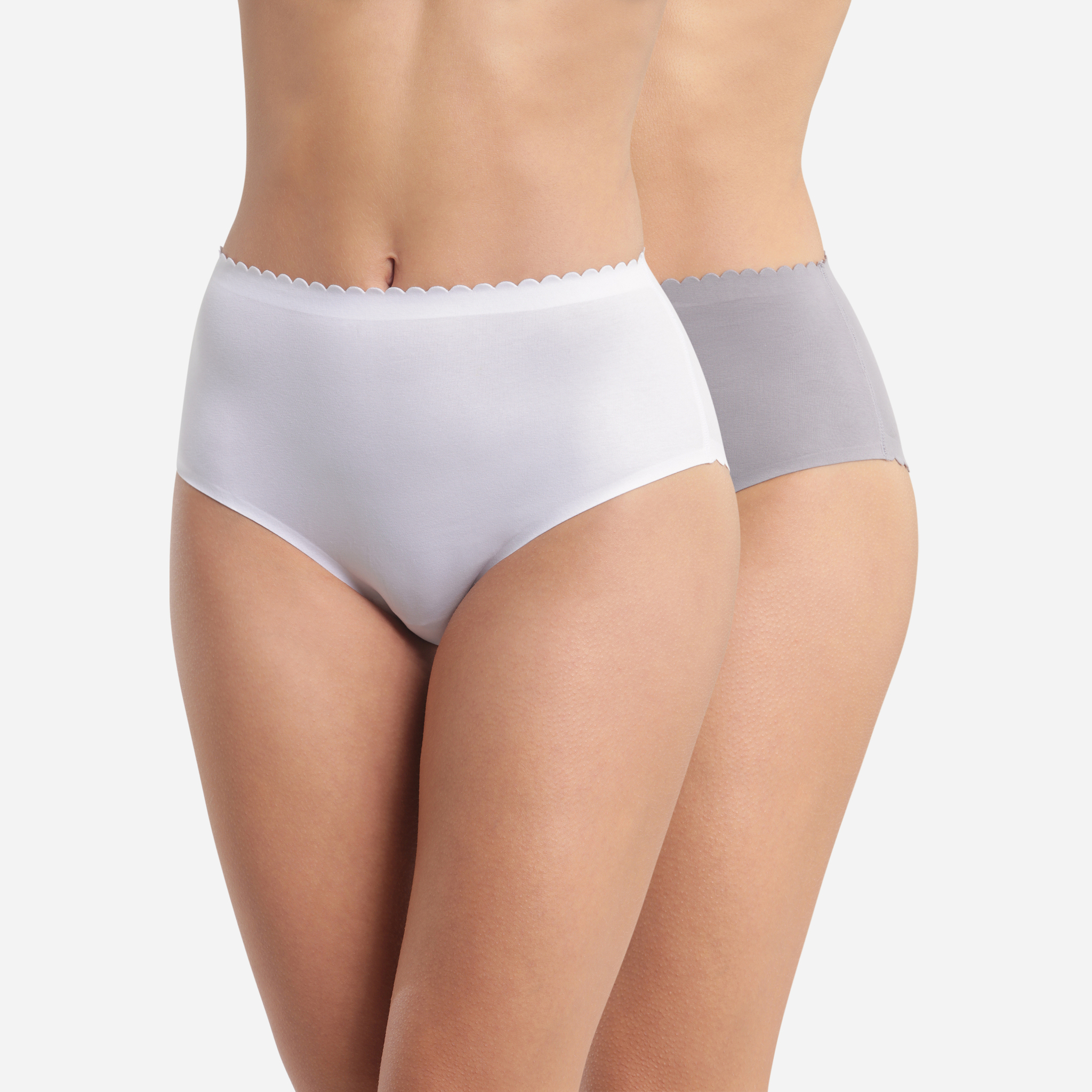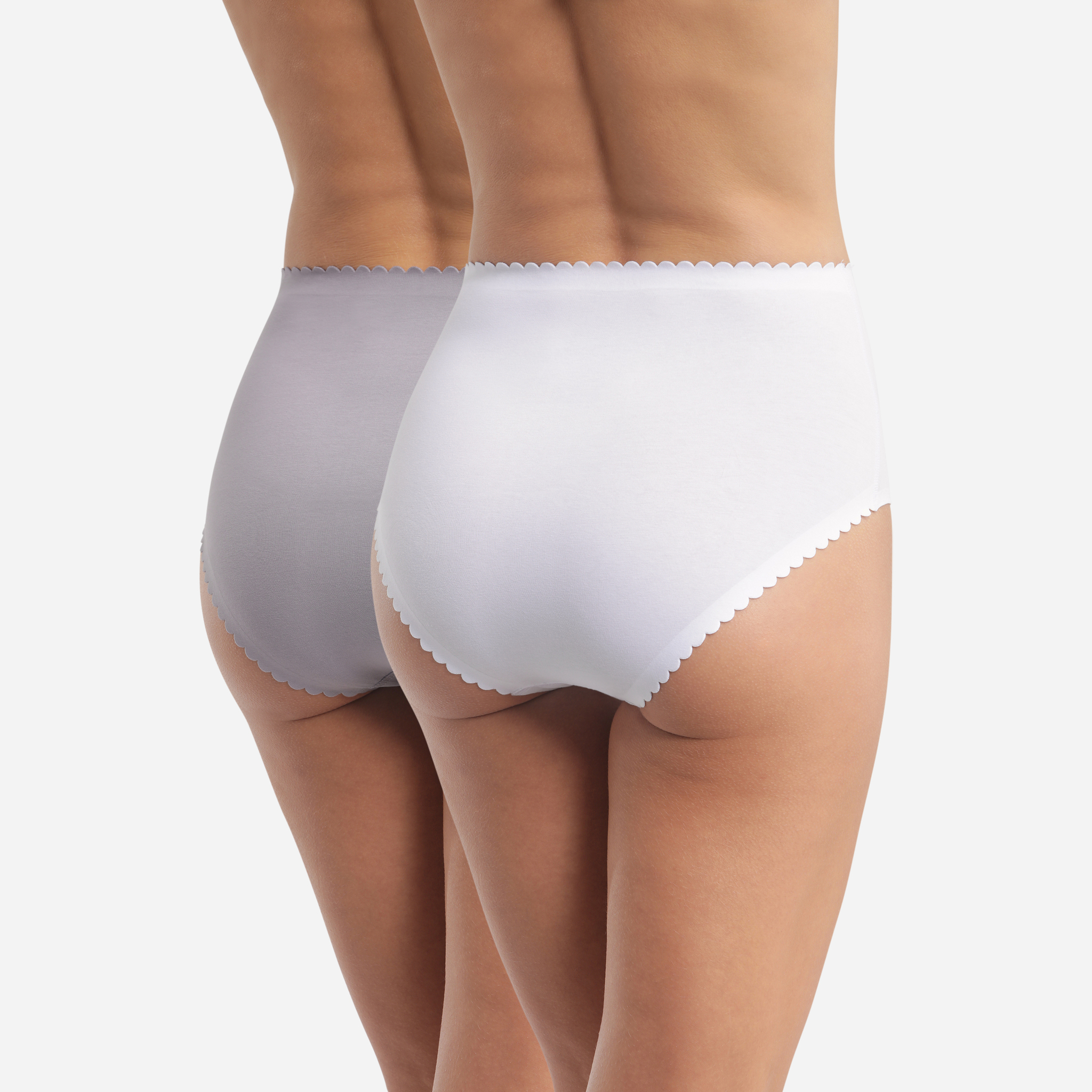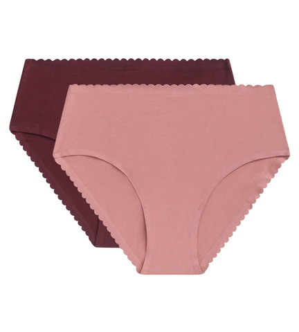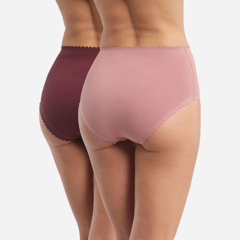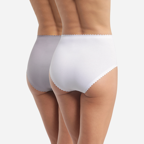 Комфортные трусы из хлопка с эластаном с классической высокой линией талии. Закрытая модель "ретро". Плоская отделка краев. Женственная отделка фестонами по линии талии. В одной упаковки два изделия в разных цветах.